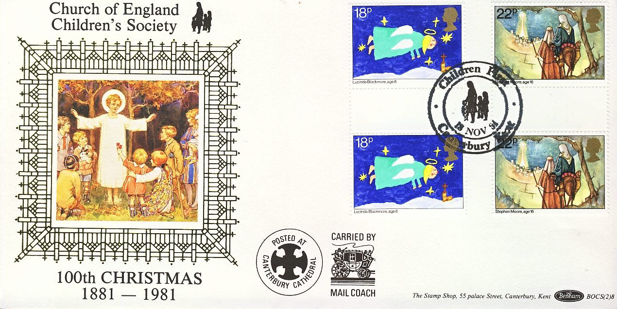 CANTERBURY Church of England Christmas stamps silk picture cover Children’s Society carried by Mail Coach Gutter Pair stamps Benham BOCS(2)8 refD150