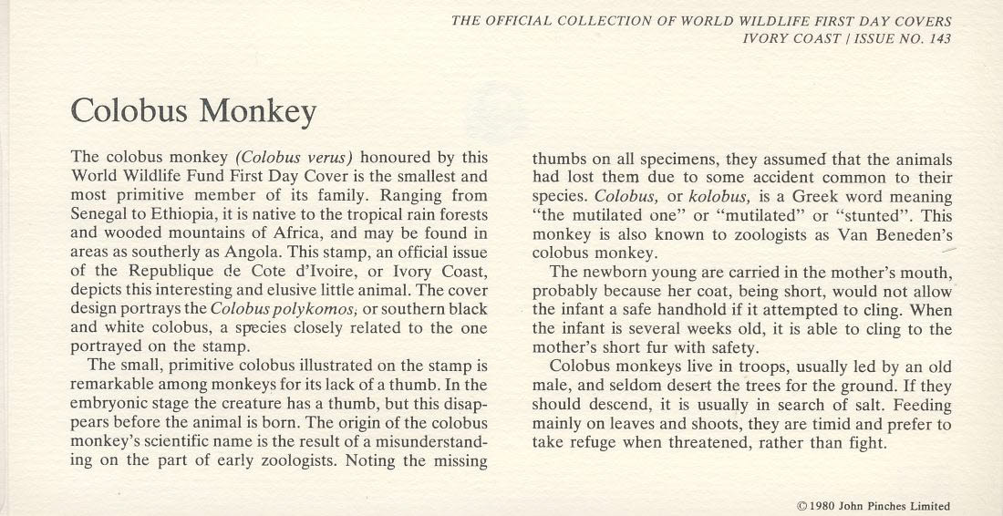 Colobus Monkey IVORY COAST Abidjan 1979 Stamp World Wildlife Fund First Day Cover FDC refWWF11 Stamp Cover with information paper regarding cover topic. A vintage lightweight cover in very good condition. Please see larger photo and full description for details.