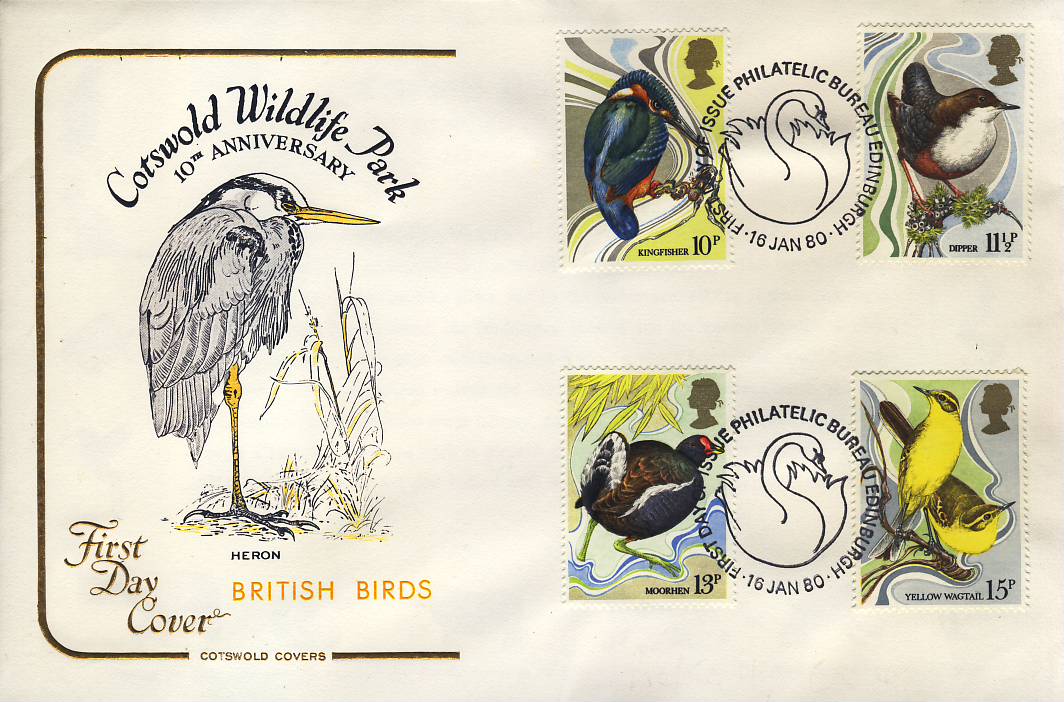 Costwold Wildlife Park 10th Anniversay Commemorative Stamps Cover refG174 with Heron illustration and Kingfisher 10p, Dipper 11½p, Moorhen 13p and Yellow Wagtail 15p stamps. VGC unsealed, with insert card.