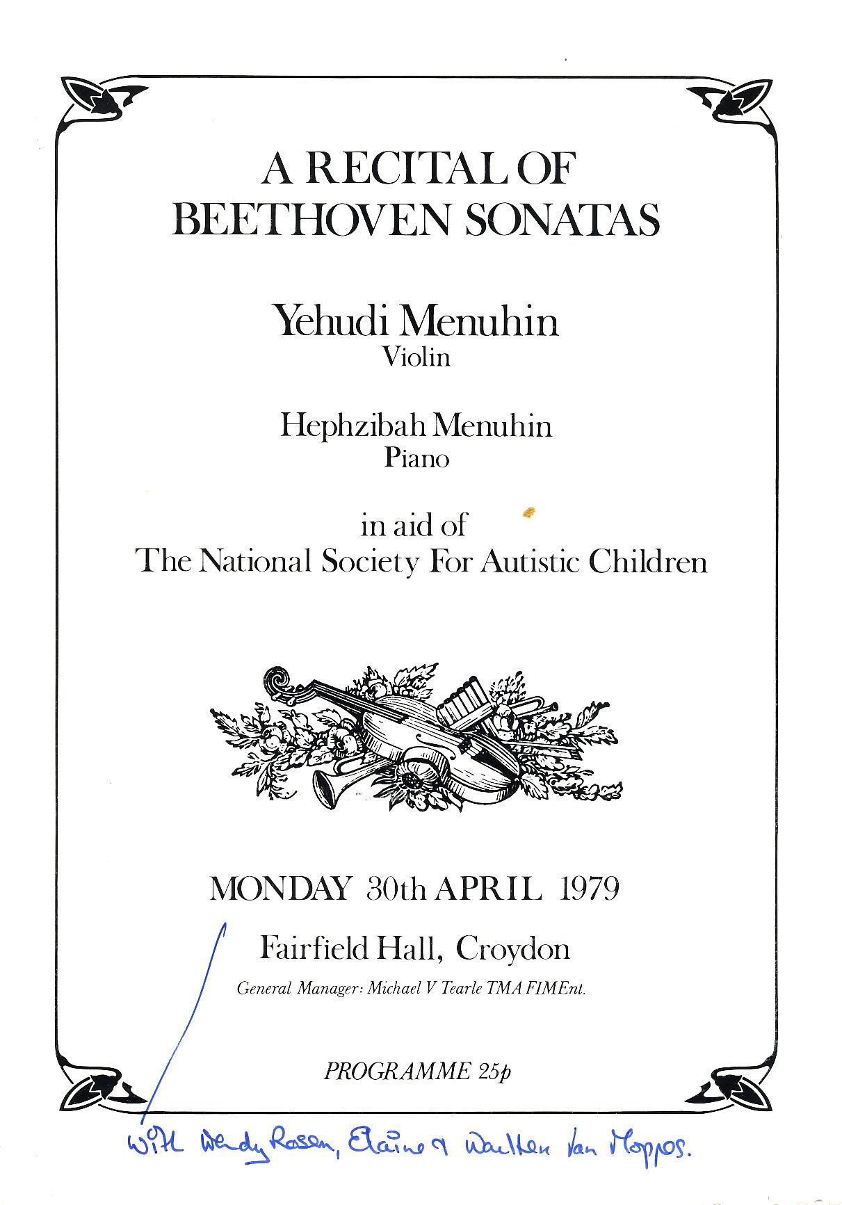 CROYDON 1979 Yehudi Menuhin BEETHOVEN SONATAS Theatre Programme refb101173 Hephzibah Menuhin. In aid of National Society for Autistic Children.