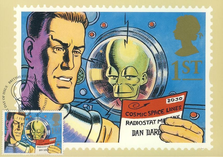 Eagle DAN DARE & THE MEKON Postcard illustrated by Paul Slater 1994 postmark refE224 Special Hand Stamped Royal Mail Postcard in Very Good Condition – address label on reverse.