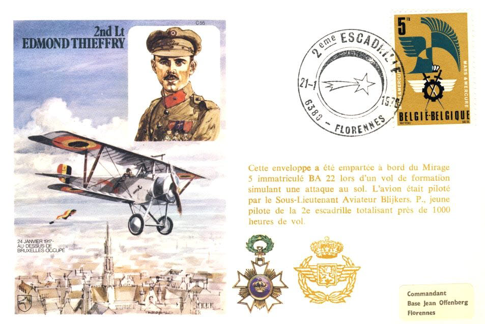 First World War Fighter Ace EDMOND THIEFFRY Florennes flown Belgium stamp cover refE76 Cover & Stamp Cover in very good condition. Unsealed – with insert. Please see larger photo and full description for details.