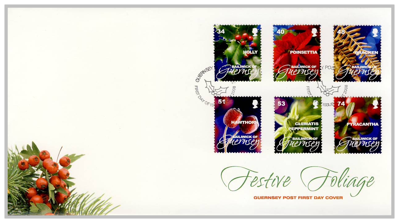 2008 Festive Foliage Guernsey Post FDC 34-74 stamps first day cover. Very Good condition with insert card. Please see larger photo for details.