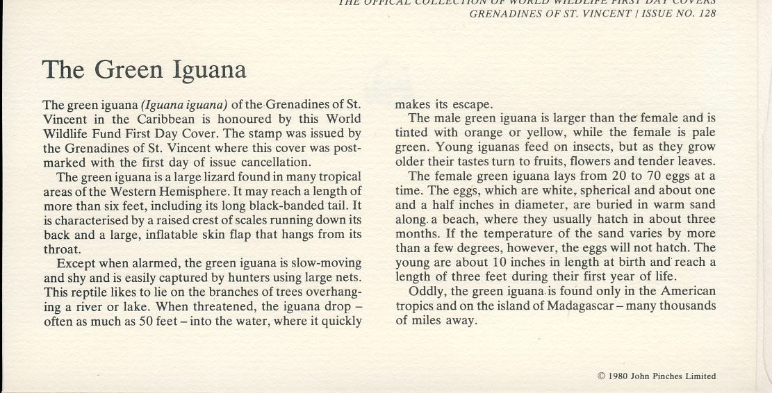 Green Iguana lizard GRENADINES OF ST. VINCENT 1979 Stamp World Wildlife Fund First Day Cover FDC refWWF32 Stamp Cover with information paper regarding cover topic. A vintage lightweight cover in very good condition. Please see larger photo and full description for details.