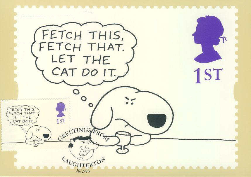 GREETINGS Fetch this, fetch that … Charles Barsotti Postcard 1996 LAUGHTERTON special hand stamp postmark refE202 Special Hand Stamped Royal Mail Postcard in Very Good Condition – address label on reverse.