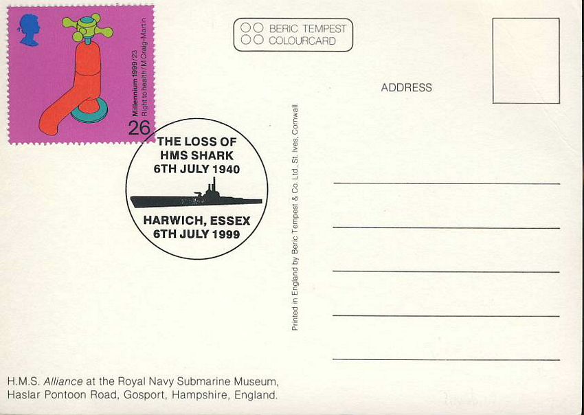 HMS Alliance Royal Navy Submarine Museum POSTCARD Loss of HMS Shark 1940 Harwich handstamp