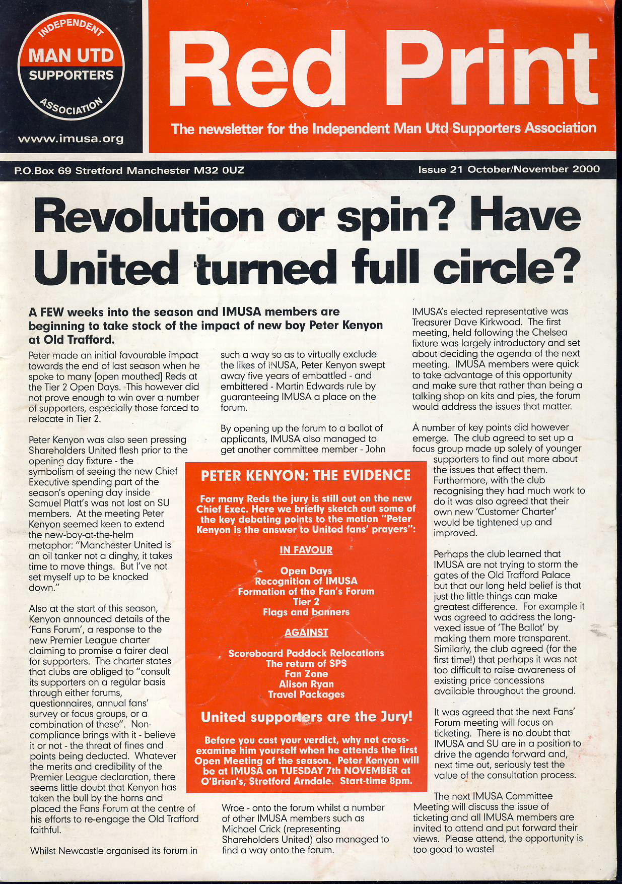 Issue 21 Oct Nov 2000 Red Print newsletter Independent Man Utd Supporter Association ref0093 A1