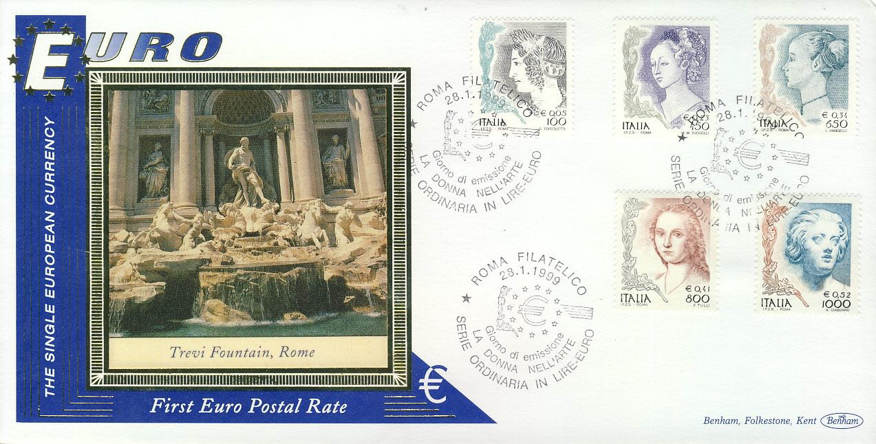 Italy Lire-EURO currency 1st postal stamps 1999 Trevi Fountain Rome Roma BENHAM silk cover refD122