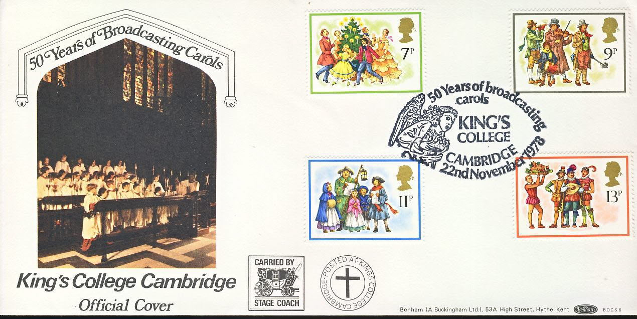 KING’S COLLEGE CAMBRIDGE Christmas Carols picture cover 50 years broadcasting official cover carried by stage coach. refD155 In very good condition. With Insert Card. Please see larger photo and full description for details.