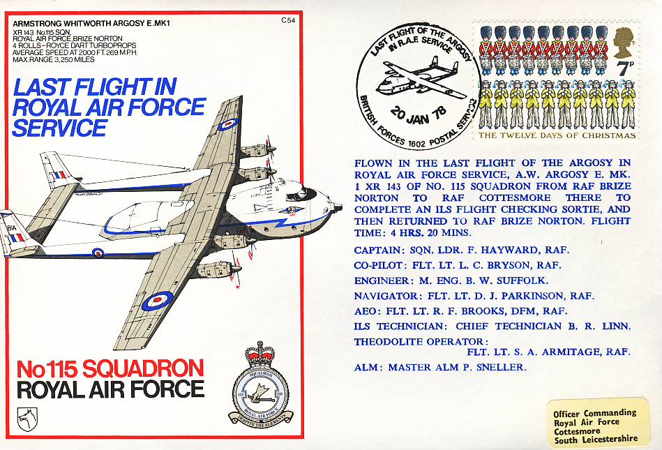Last flight of the Argosy 1978 RAF No115 Squadron flown stamp cover BFPO 1602 refF167