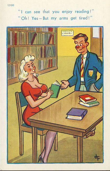 LIBRARY man with woman reading Vintage Comic Postcard refB1