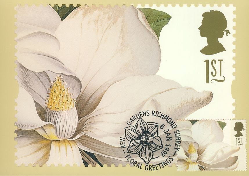 MAGNOLIA ALTISSIMA painting by GD Ehret Postcard special FLORAL GREETING KEW hand stamp postmark 1997 refE213 Special Hand Stamped Royal Mail Postcard in Very Good Condition – address label on reverse.