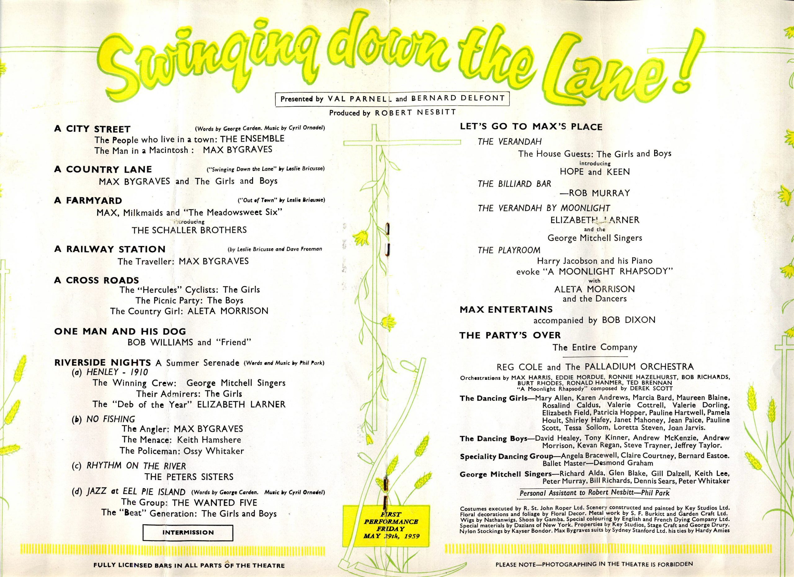 MAX BYGRAVES London Palldium 1959 Vintage Theatre Programme Swinging down the Lane! ref101690