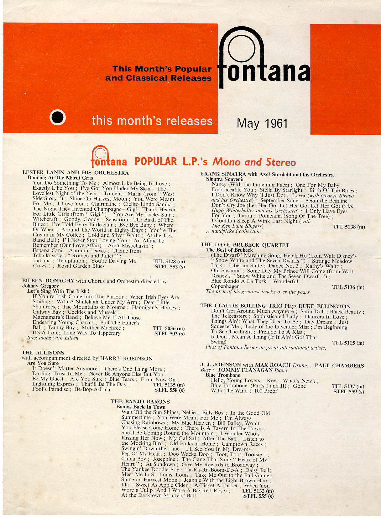 May 1961 Fontana popular and classical releases leaflet ref101653