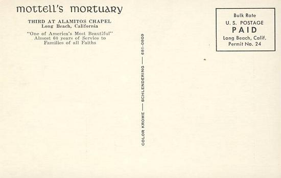 Mottells Mortuary Third at Alamitos Chapel Long Beach Calif vintage POSTCARD b3