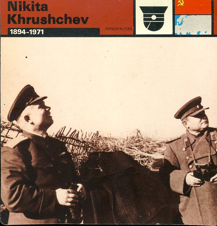 Nikita Khrushchev 1894-1971 Russian politician – WWII card refP5 TOPIC: World War II – Cards Printed in Italy by Edito-Service S.A.Geneva 1977. Reverse side of card is text information all about the topic on the front. Card in good condition for age. Please see large photos and description for details.