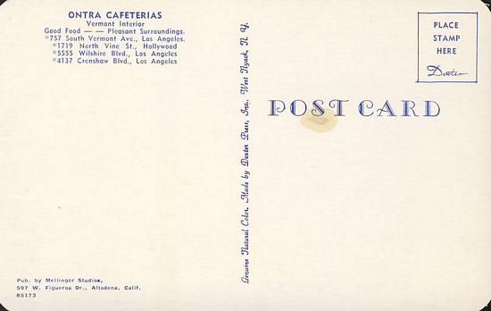 Ontra Cafeterias Vermont Interior Los Angeles and Hollywood VINTAGE POSTCARD box3
