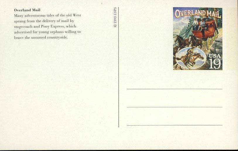 Overland Mail stagecoach Pony Express 1993 USPS Postcard refUSA P4 printed stamp