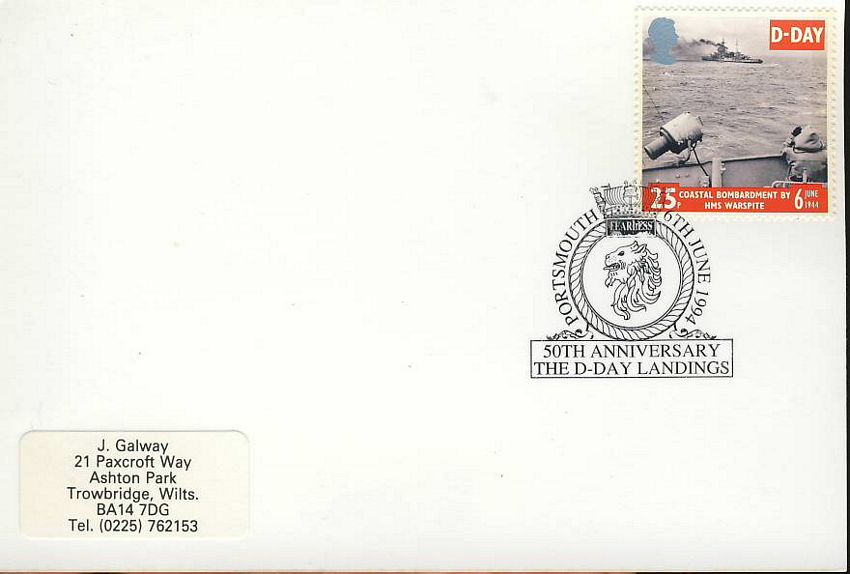 REAL PHOTO PRINT HMS L10 with 50th Anniversary D-Day Landings Portsmouth handstamp HMS WARSPITE stamp