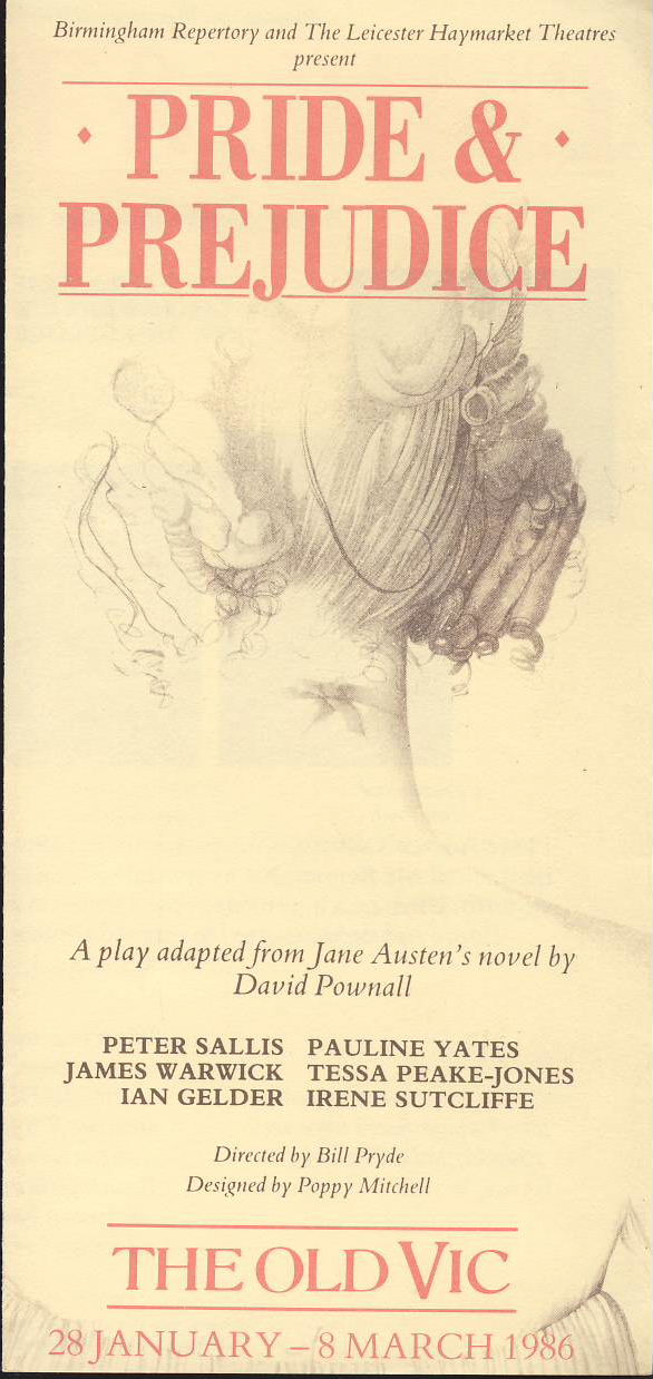 Pride Prejudice 1986 PETER SALLIS The Old Vic Theatre bi-fold leaflet / programme ref0051 A1 Pre-owned item. Measures approx 21cm x 10cm – folded leaflet type programme. Cast includes Pauline Yates, James Warwick, Tessa Peake-Jones, Ian Gelder and Irene Stucliffe