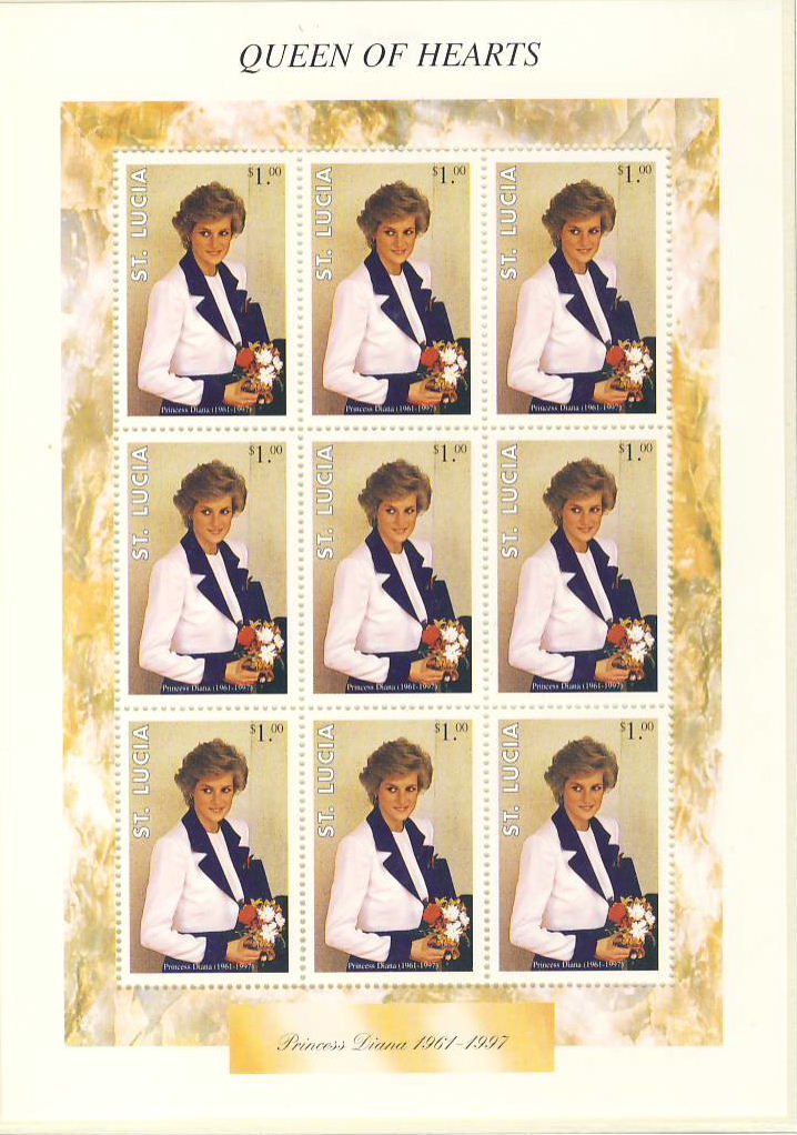 Princess Diana QUEEN OF HEARTS St Lucia MS 9 x $1 stamp sheet refDA Diana Princess of Wales 1961-1997 Westminster collectors series. Unused. Ideal Gift. Very good condition