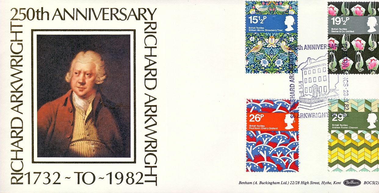 RICHARD ARKWRIGHT 1982 British Textiles Willam Morris, Paul Nash, Andrew Foster, Steiner & Co. stamps cover Benham refE26 Cover in very good condition. Unsealed with insert. Please see larger photo and full description for details.