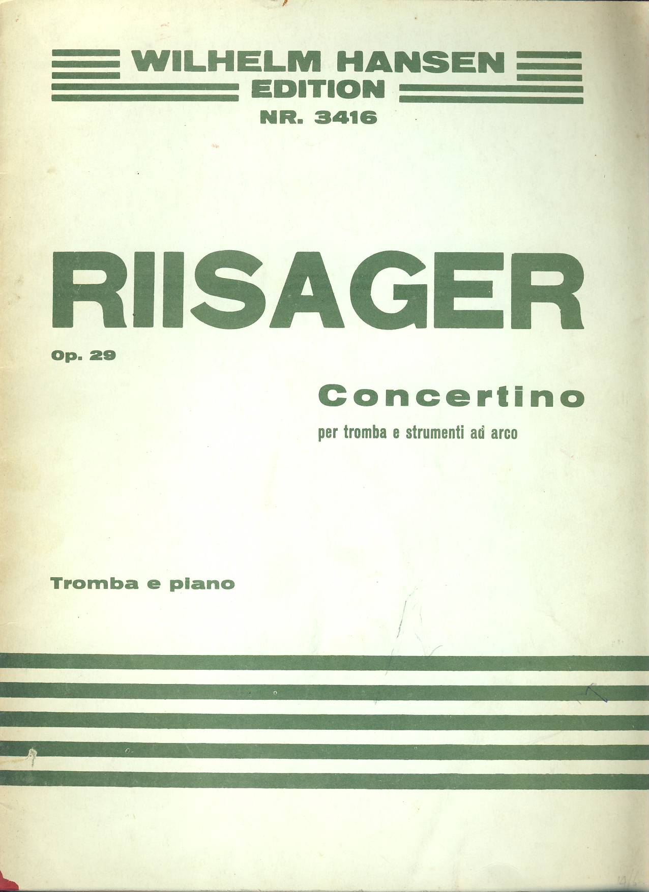 RIISAGER Op.29 Tromba e Piano CONCERTINO sheet music book ref101552 20 PAGES PLUS 2 pull outs for Tromba in B and Tromba in C. Undated Wilhelm Hansen Edition Nr.3416 Pre-owned item.