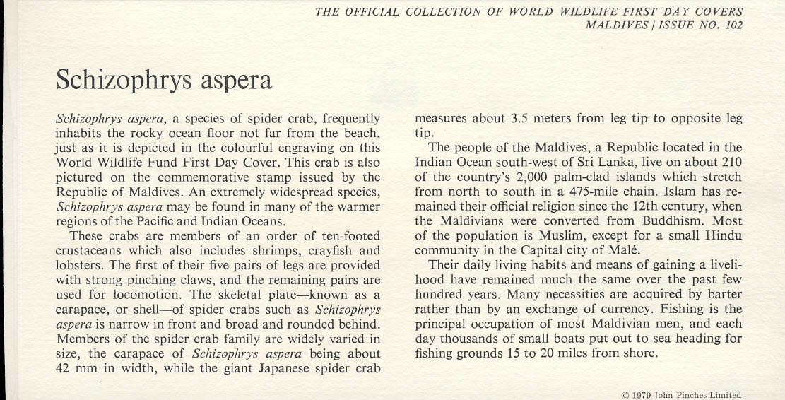 Schizophrys aspera spider crab MALE MALDIVES 1978 Stamp World Wildlife Fund First Day Cover FDC refWWF42 Stamp Cover with information paper regarding cover topic. A vintage lightweight cover in very good condition. Please see larger photo and full description for details.
