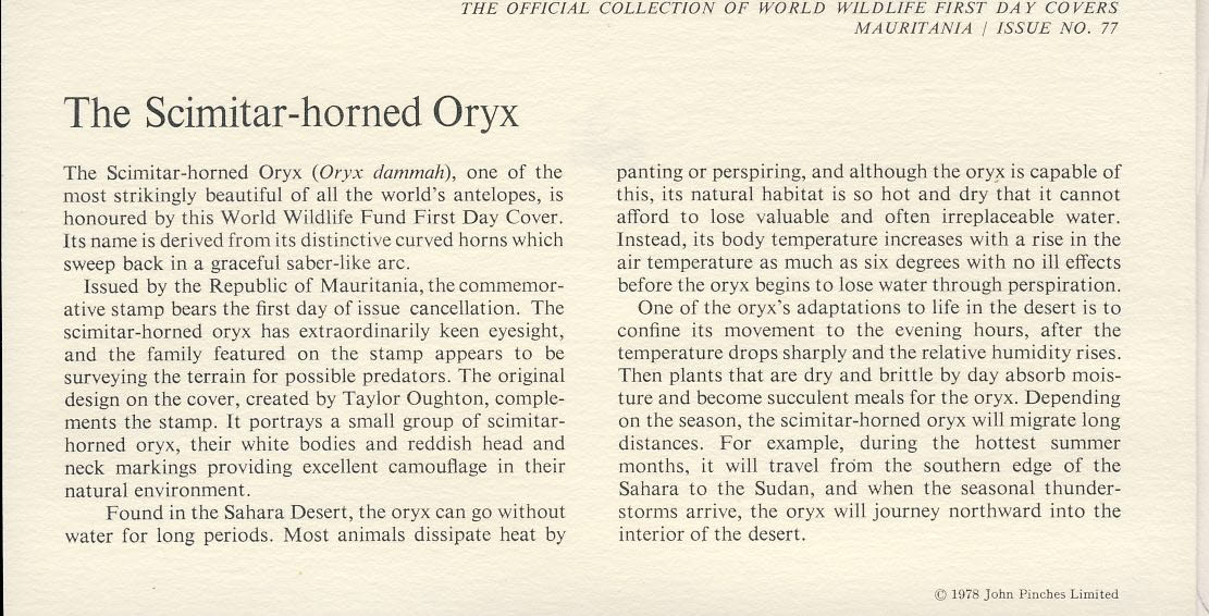 Scimitar-horned Oryx antelopes NOUAKCHOTT Republique Islamique MAURITANIA 1978 Stamp World Wildlife Fund First Day Cover FDC refWWF65 Stamp Cover with information paper regarding cover topic. A vintage lightweight cover in very good condition. Please see larger photo and full description for details.