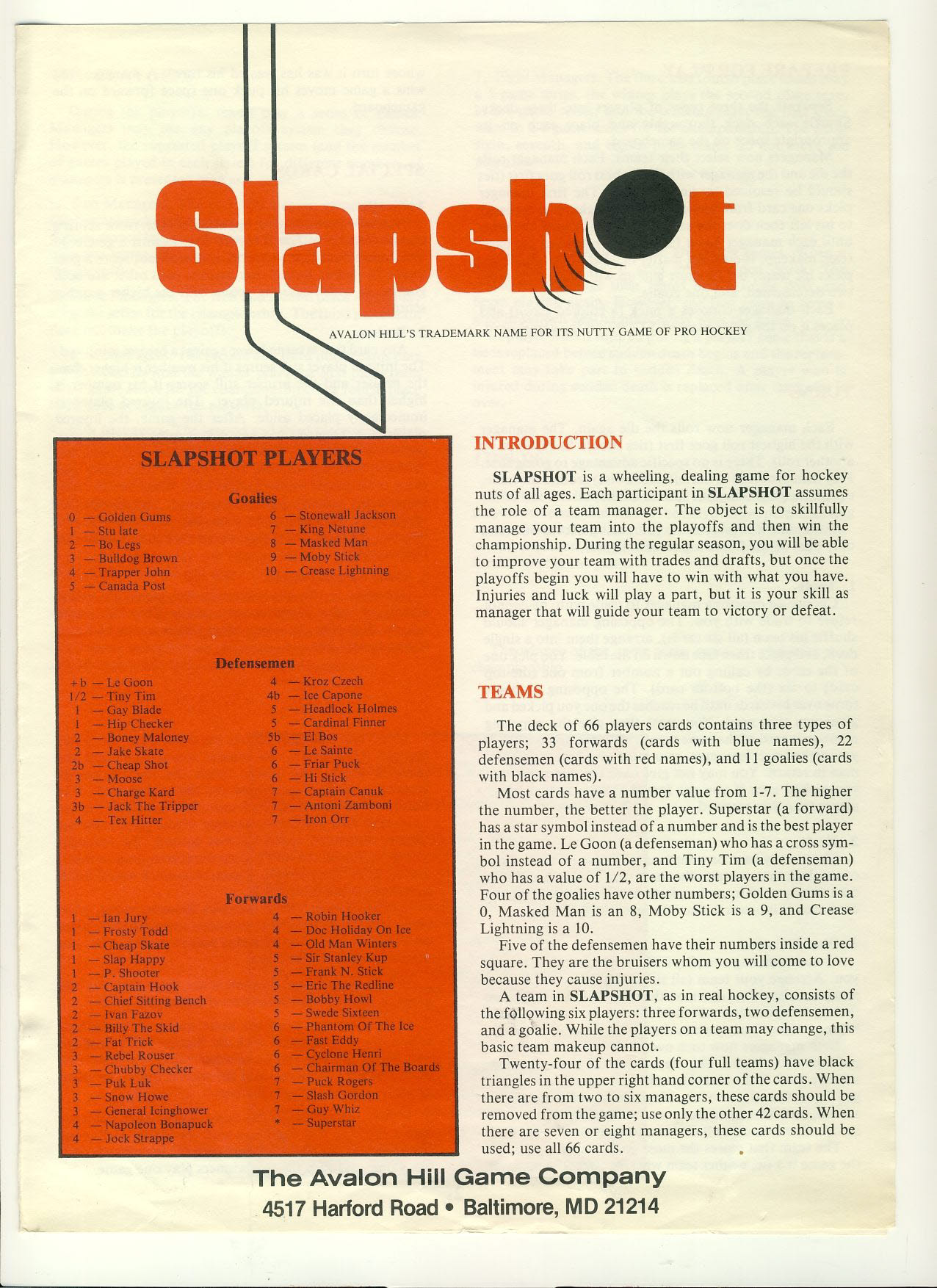 Slpashot Avalon Hill Pro Hockey Game Rules 4 pages ref100006