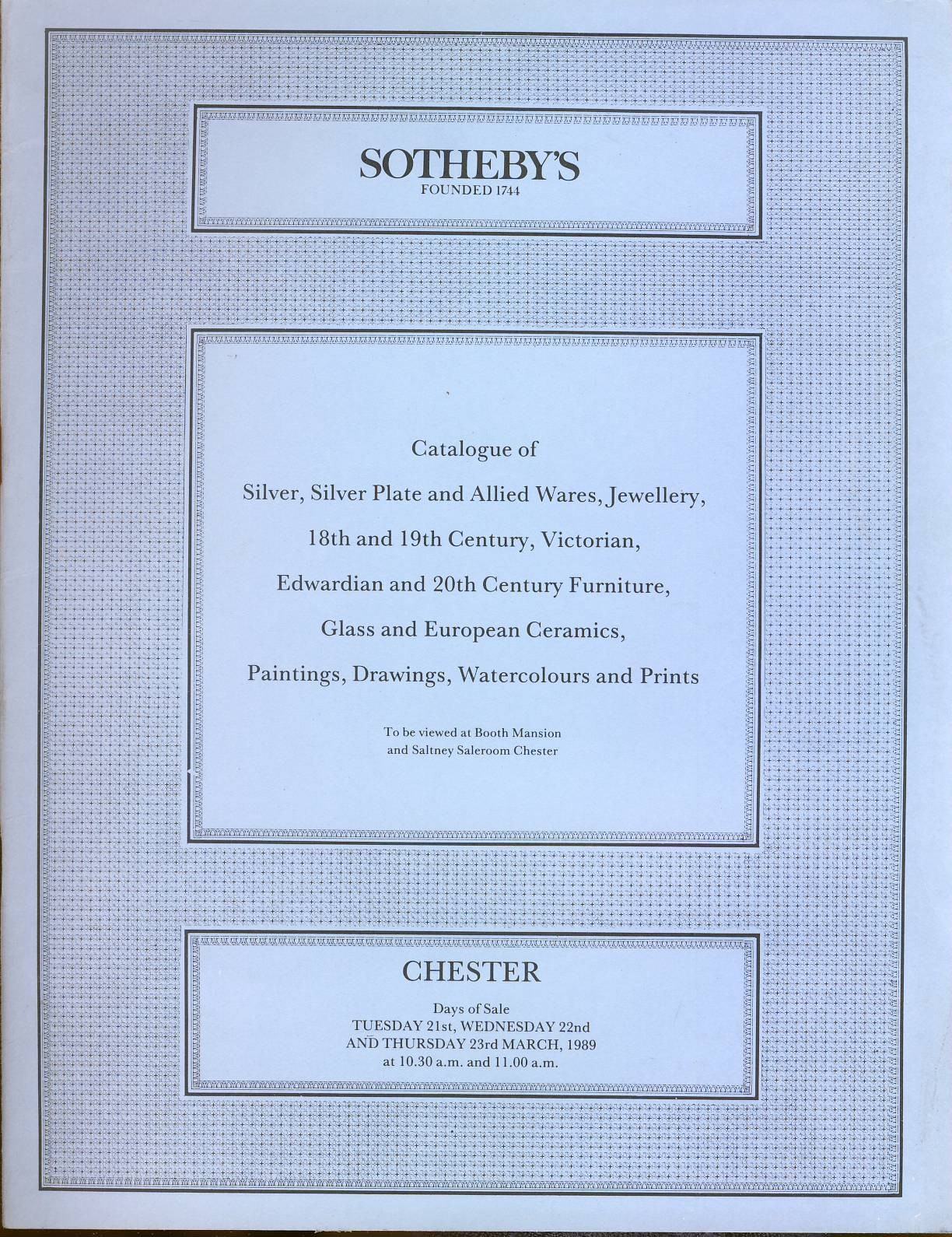 SOTHEBY’S Chester 1989 Auction Catalogue for Silver, Jewellery, Furnture, Ceramics, Paintings etc – Used catalogue in good condition with pen annotation marks. ref1-31