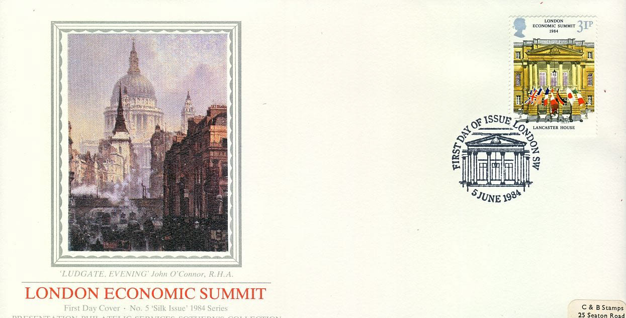 Sotheby’s LUDGATE EVENING John O’Connor RHA London Economic Summit 1984 stamp cover PPS refE39
