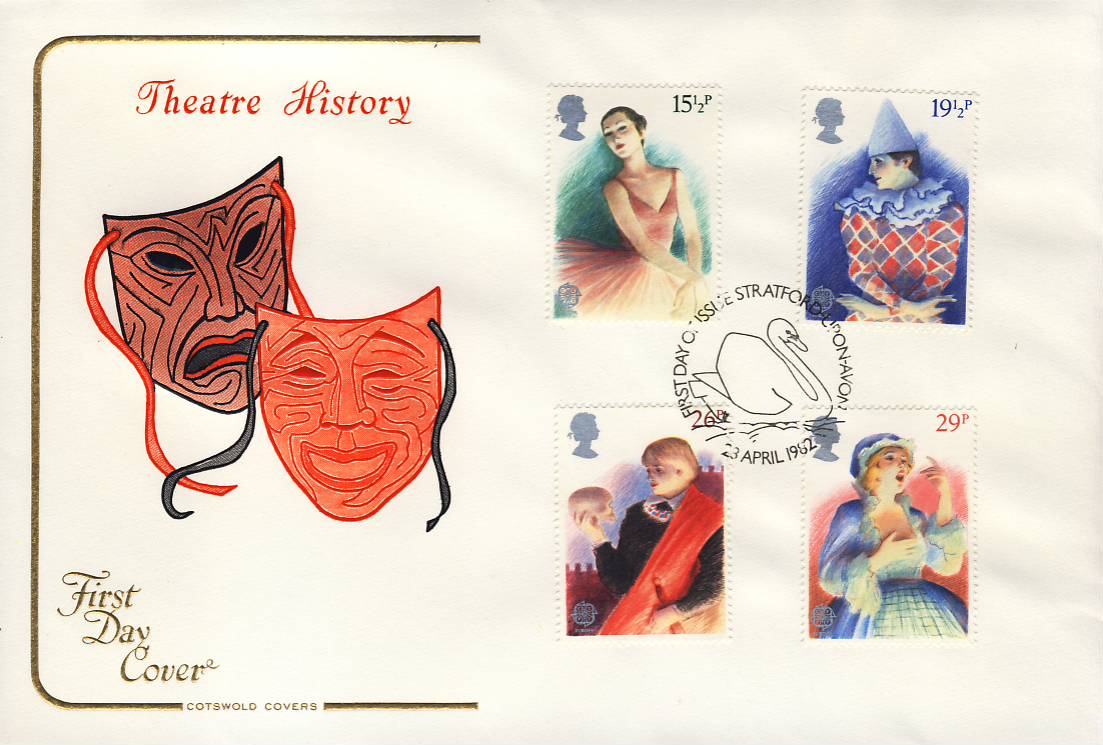 STRATFORD UPON AVON Theatre History 1982 FDC Cotswold Stamp Cover refG122 VGC showing masks, tamps for ballerina, Harlequin and Shakespeare.