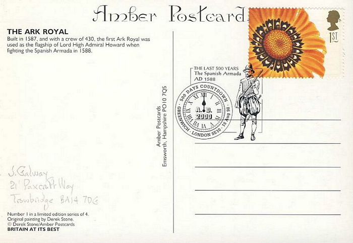 The Ark Royal 1587 Armada POSTCARD GREENWICH 500 DAYS AD2000 countdown handstamp