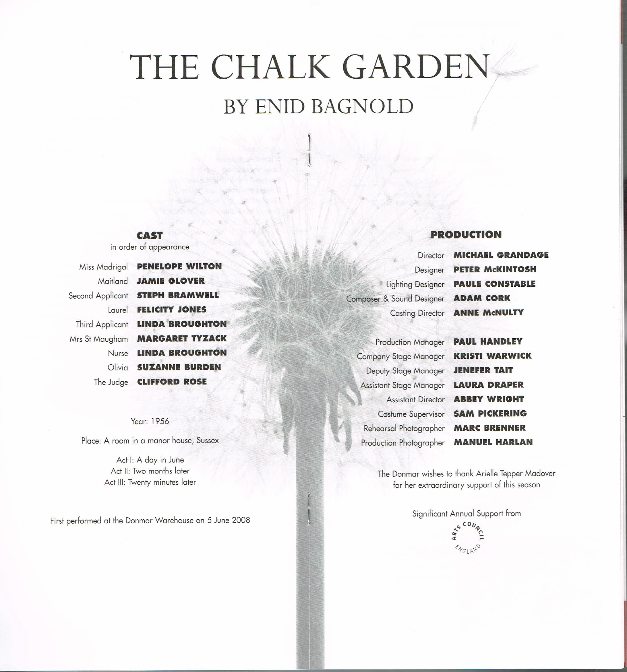 The Chalk Garden ENID BAGNOLD 2008 PENELOPE WILTON, JAMIE GLOVER, CLIFFORD ROSE et al – see photos Theatre Programme refb1608 Used Programme in Very Good Condition. Date written in cover. Measures approx 30cm x 14cm