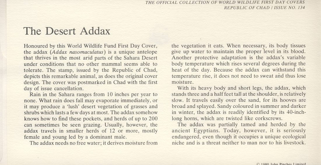 The Desert Addax N’DJAMENA Republic of Chad 1979 Stamp World Wildlife Fund First Day Cover FDC refWWF20 Stamp Cover with information paper regarding cover topic. A vintage lightweight cover in very good condition. Please see larger photo and full description for details.