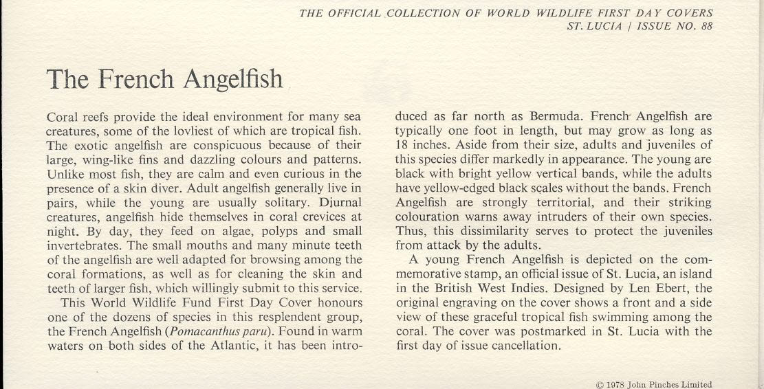 The French Angelfish CASTRIES ST. LUCIA 1978 Stamp World Wildlife Fund First Day Cover FDC refWWF52 Stamp Cover with information paper regarding cover topic. A vintage lightweight cover in very good condition. Please see larger photo and full description for details.