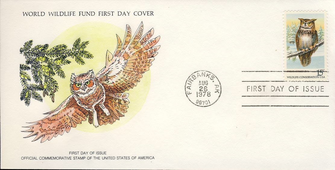 The Great Horned Owl bird FAIRBANKS ALASKA 1978 Stamp World Wildlife Fund First Day Cover FDC refWWF48
