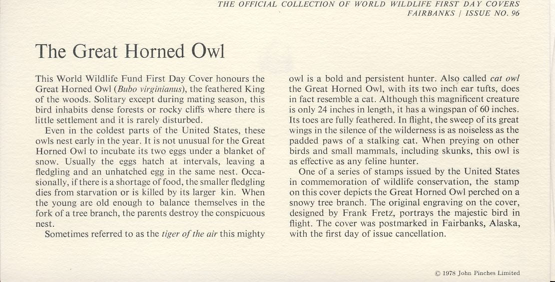 The Great Horned Owl bird FAIRBANKS ALASKA 1978 Stamp World Wildlife Fund First Day Cover FDC refWWF48 Stamp Cover with information paper regarding cover topic. A vintage lightweight cover in very good condition. Please see larger photo and full description for details.