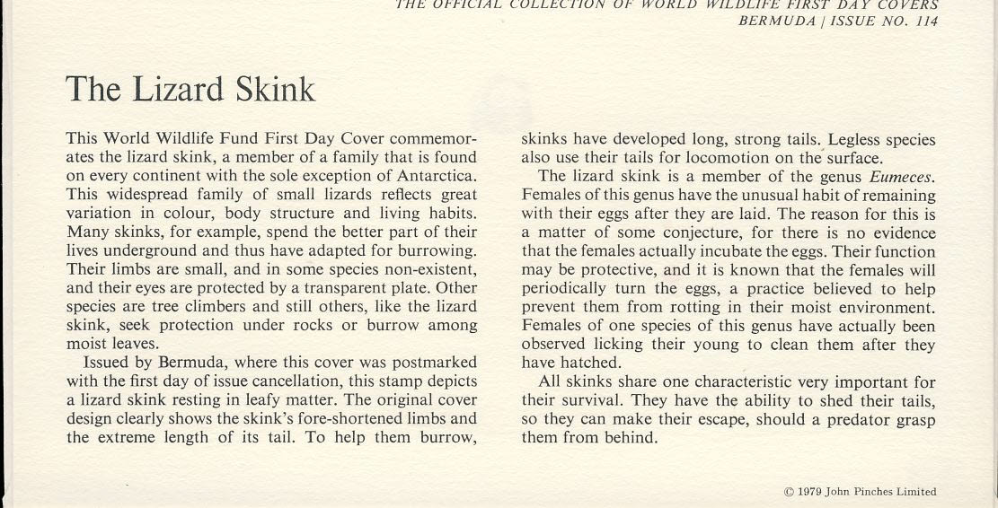 The Lizard Skink BERMUDA 1979 Stamp World Wildlife Fund First Day Cover FDC refWWF36 Stamp Cover with information paper regarding cover topic. A vintage lightweight cover in very good condition. Please see larger photo and full description for details.