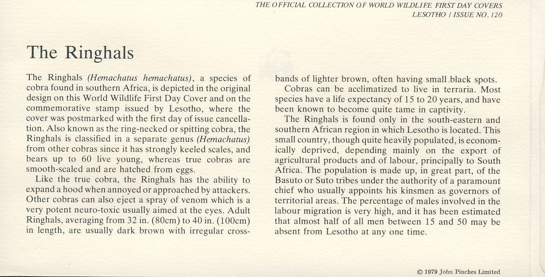 The Ringhals cobra snake Africa MASERU LESOTHO 1979 Stamp World Wildlife Fund First Day Cover FDC refWWF72 Stamp Cover with information paper regarding cover topic. A vintage lightweight cover in very good condition. Please see larger photo and full description for details.