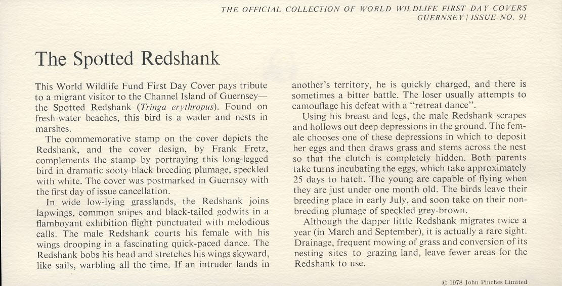 The Spotted Redshank bird GUERNSEY 1978 Stamp World Wildlife Fund First Day Cover FDC refWWF49 Stamp Cover with information paper regarding cover topic. A vintage lightweight cover in very good condition. Please see larger photo and full description for details.