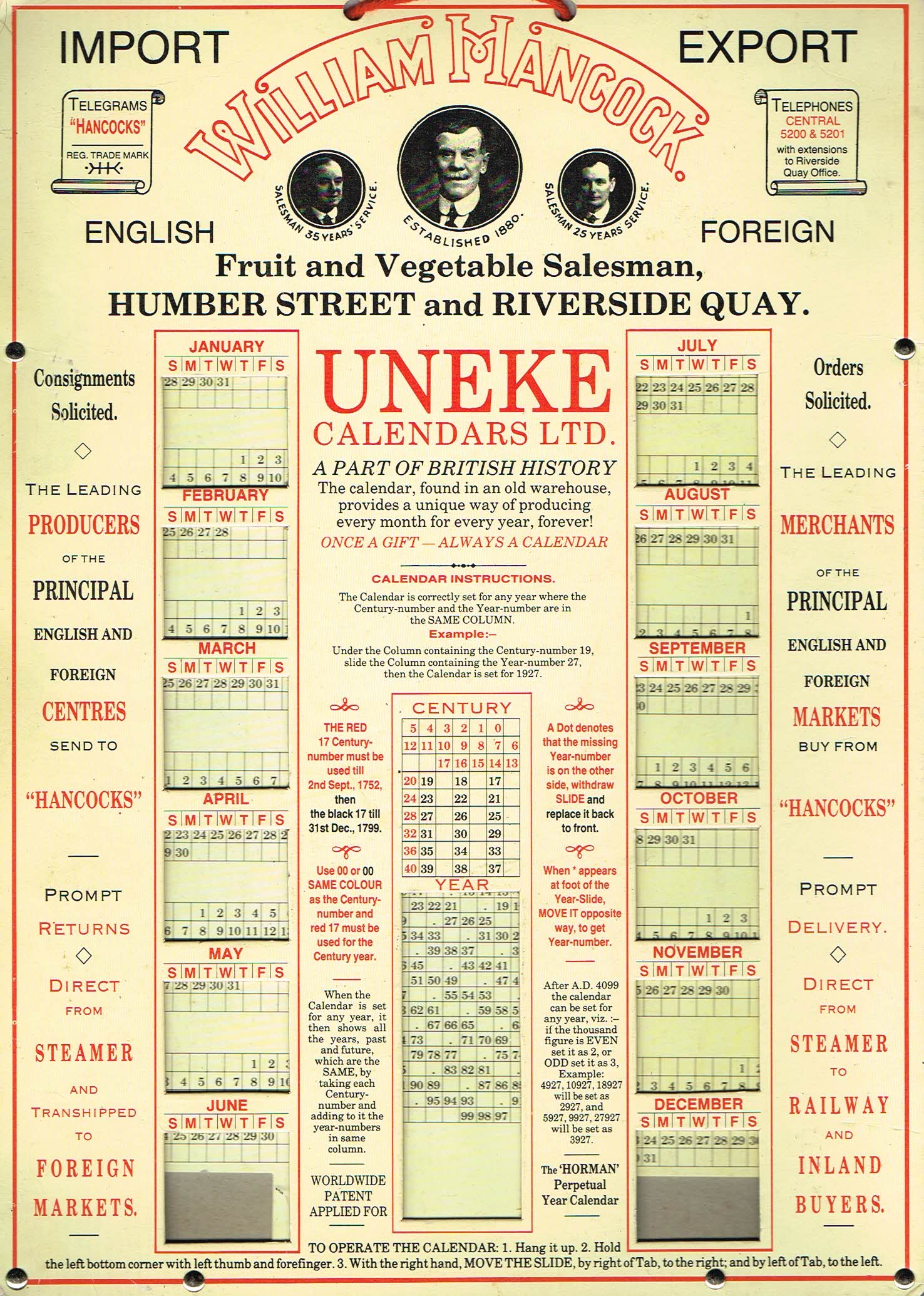 Vintage UNEKE CALENDAR Blackburn serial no.1881 HANCOCKS Fruit & Vegetable Salesman HUMBER STREET and RIVERSIDE QUAY – date unknown.