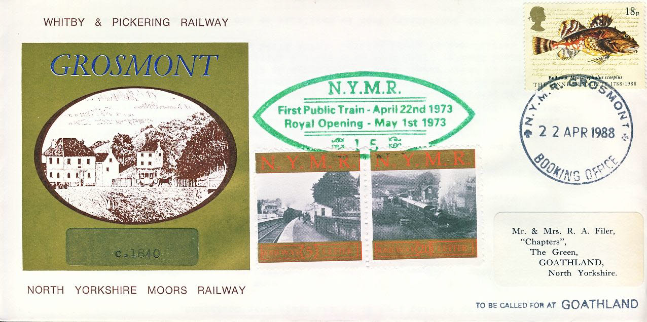 Whitby & Pickering Railway Royal Opening 1973 Booking Office GROSMONT NYMR 1988 stamp cover refD239